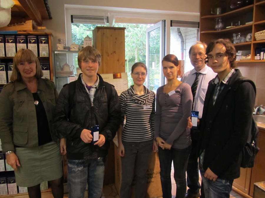 Um Genauigkeit in Millilitern ging es im Teekontor. Hier konnten Schüler ihren eigenen Tee anmischen und mit Aroma versetzen. Dabei mussten sie sich ganz genau an die angegebenen Mengen halten, damit der Tee immer den gleichen Geschmack erhält. „Ich wusste gar nicht, wie viel abwechslungsreiche Arbeit dahinter steckt“, wunderten sich Christoph Naumann und Jonas Holthusen, die Tee in einer großen Schüssel rührten. Zuvor hatten sie schon Station bei Corax, den Stadtwerken und CJ Schmidt gemacht.