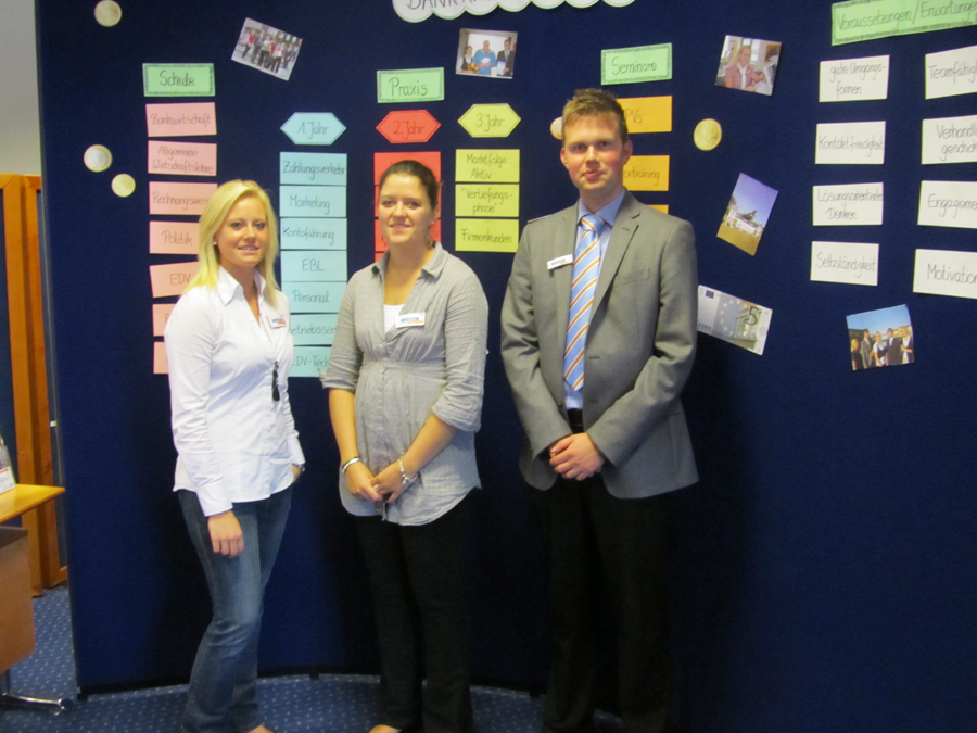 Hauptsächlich Fragen zu den Voraussetzungen einer Ausbildungsstelle und dem Verdienst beantworteten Sören Hansen, Laura Rölcke und Lisa Schwanz in der VR-Bank am Markt. Sören und Laura, selber Azubis waren erstaunt und erfreut, wie viele den Weg zu ihnen gefunden hatten. Sie haben bereits ihre Traumausbildung gefunden und freuten sich, anderen bei der Entscheidung behilflich sein zu können.